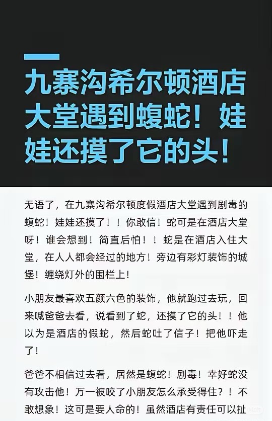 参观者在朱兹哈古(Jiuzhaigou)的一家酒店大厅里发现有毒蛇:“这个孩子认为这是假蛇,他抓住了蛇的头。”当地动物保护部门回应